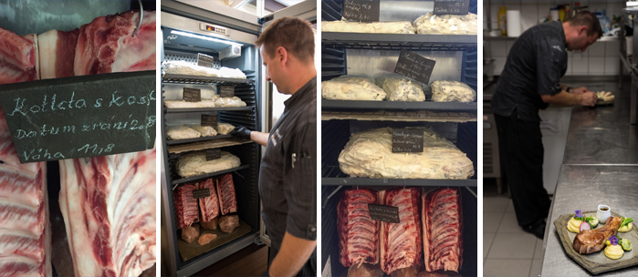 Zrající maso můžete vidět v Dry Ageru přímo v prostorách restaurace hotelu. Dle toho, jak maso postupně dozrává, kuchaři maso postupně zpracovávají a připravují pravidelně aktualizovanou nabídku pokrmů.