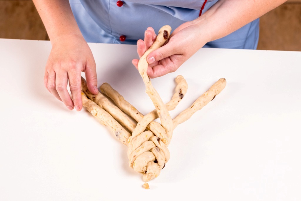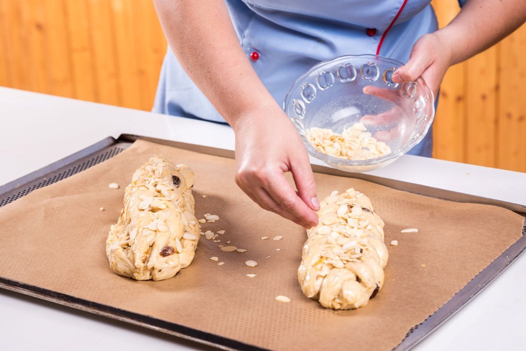 - Z bochánků vyválíme stejně dlouhé prameny, položíme je pěkně vedle sebe a začneme plést. Vždy svrchu dolů, zleva doprava až k tomu poslednímu - jinak se prameny vytahují a mění délku. Vánočku přeneseme na plech, potřeme ji rozšlehaným vajíčkem a posypeme plátky mandlí.
